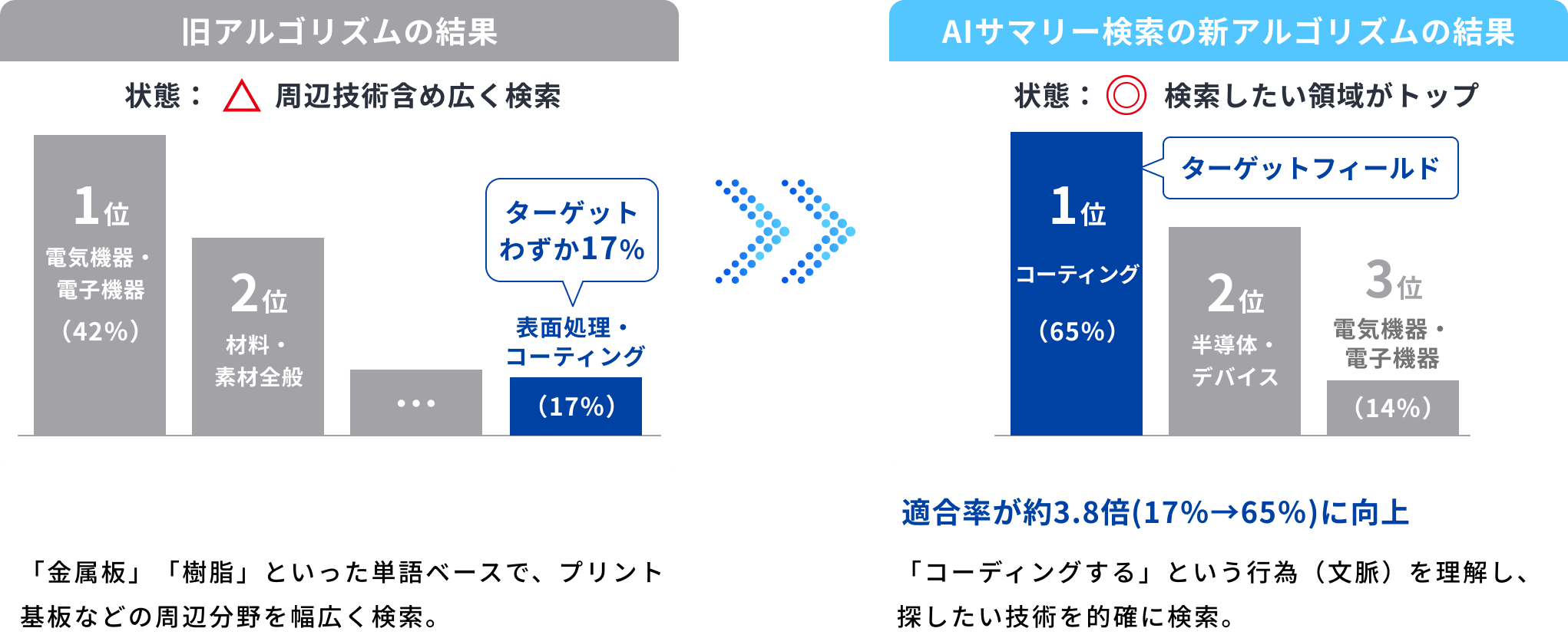 検証結果:「適合率」が3.8倍向上 検索クエリ:「樹脂をコーティングした金属板の製造方法」