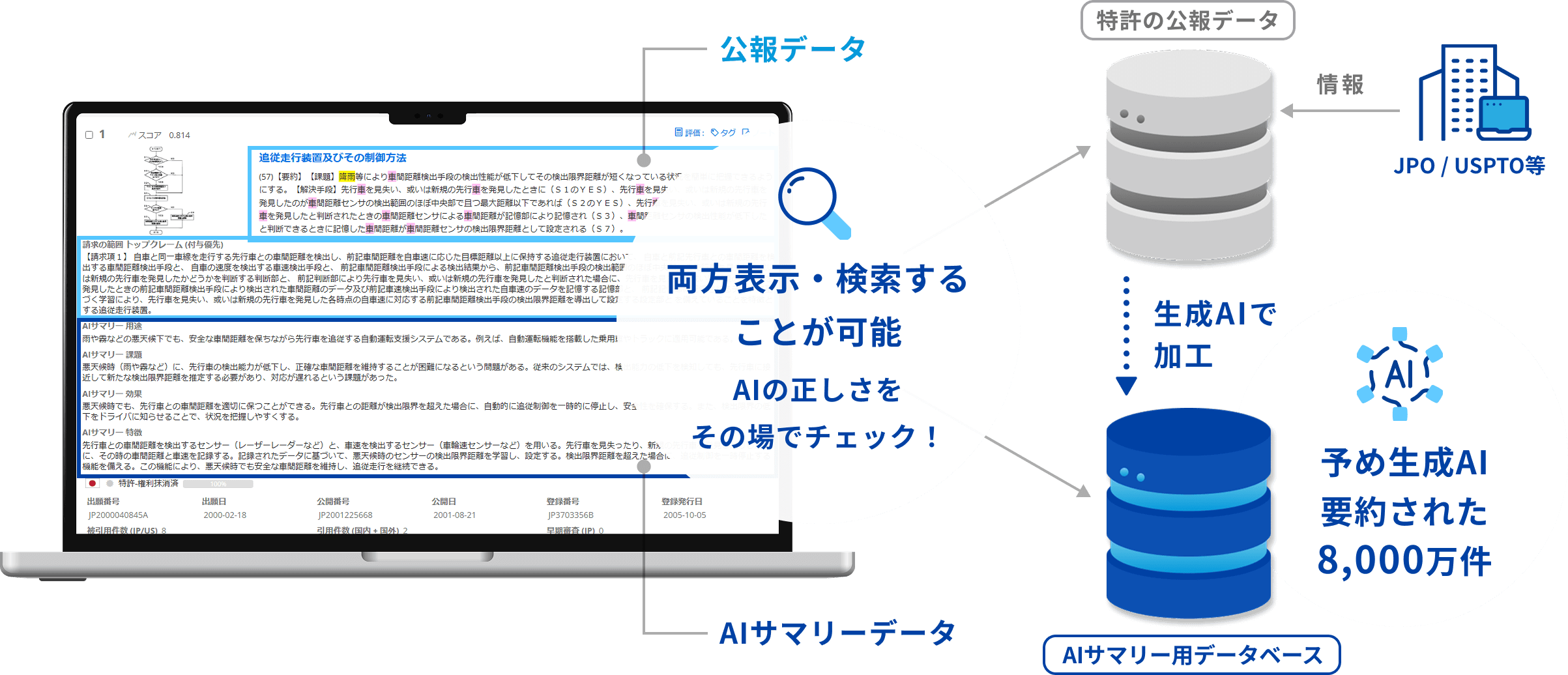 約8,000万件の公報データをあらかじめ生成AIで要約した、独自のAIサマリー・データを収録し、