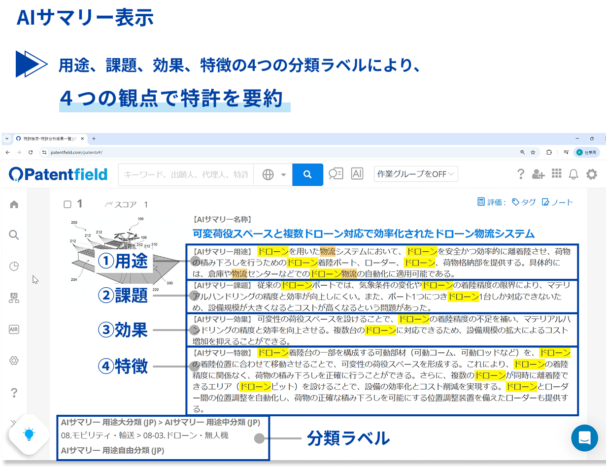 発明の用途・課題を体系的に独自分類した、用途ラベルと課題ラベルを収録し、直感的な発明の理解をサポートします。