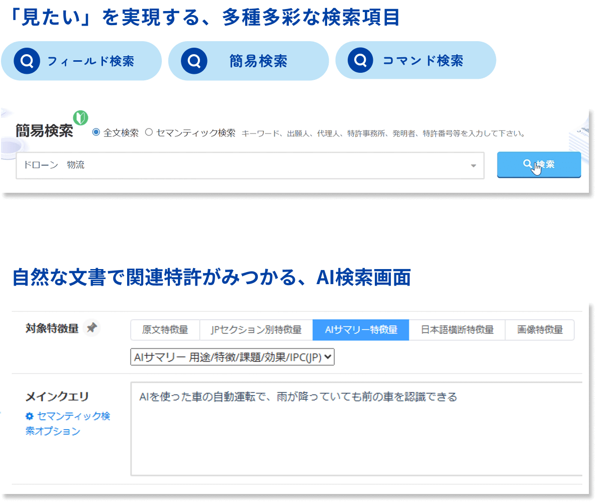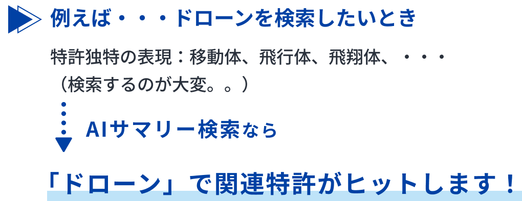 専門用語を知らなくても、普段使っている平易な用語やキーワードを入力するだけで、関連する特許がヒットしやすくなります。
