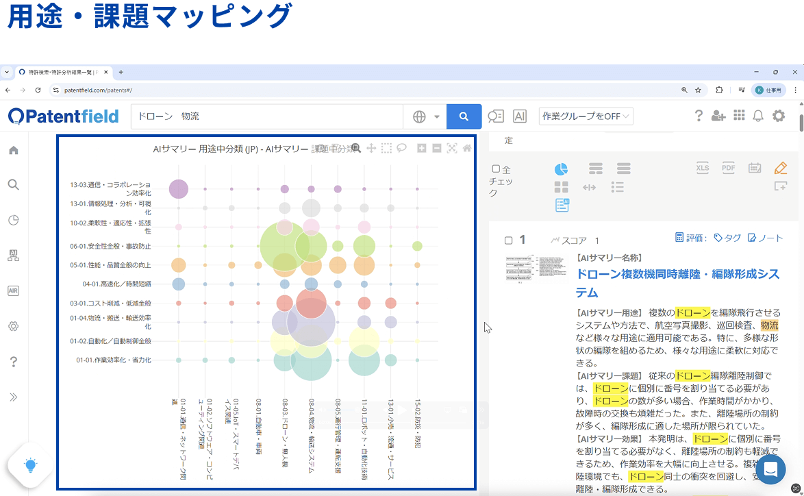 特定の技術分野において、どのような「課題」に対し、どのような「用途」の特許が多く出願されているかを瞬時にマッピングし可視化できます。